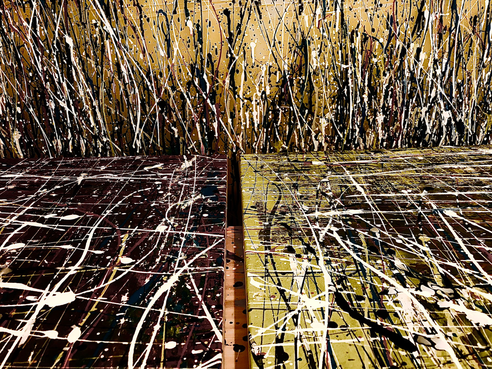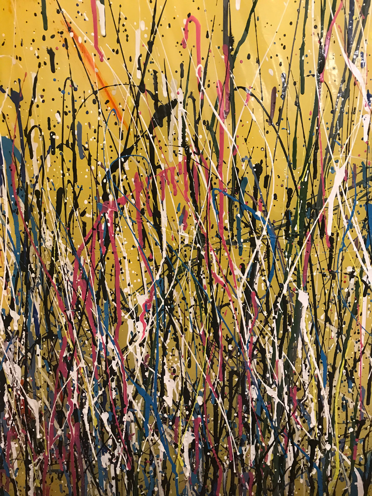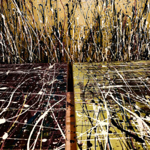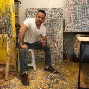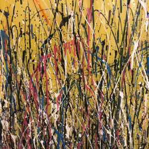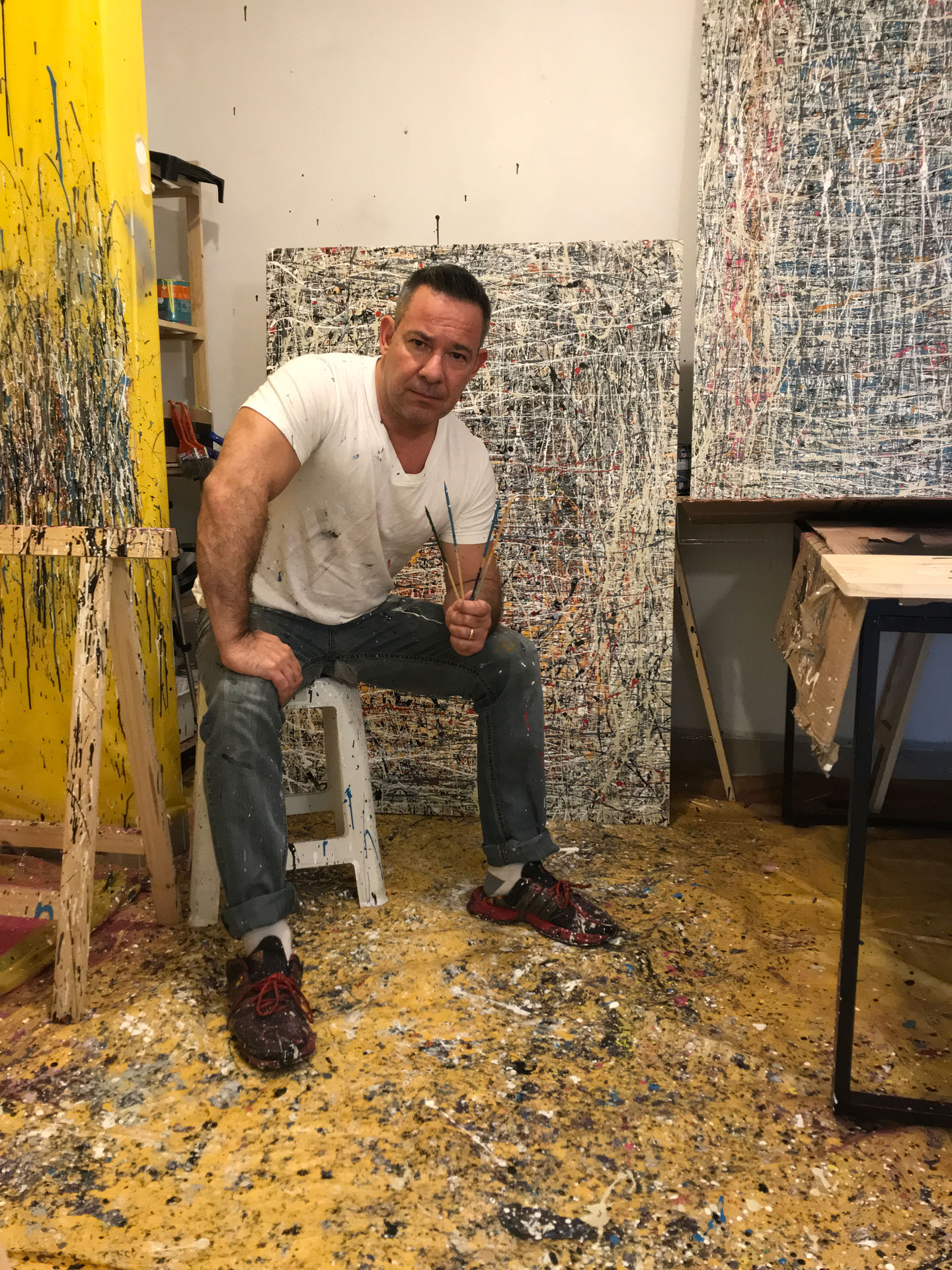Adopting an unique abstract style of spontaneous and energetic moves, the artist attacks the canvas creating an havoc of layers that converge into an elaborated tapestry.