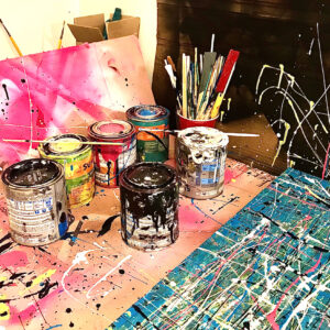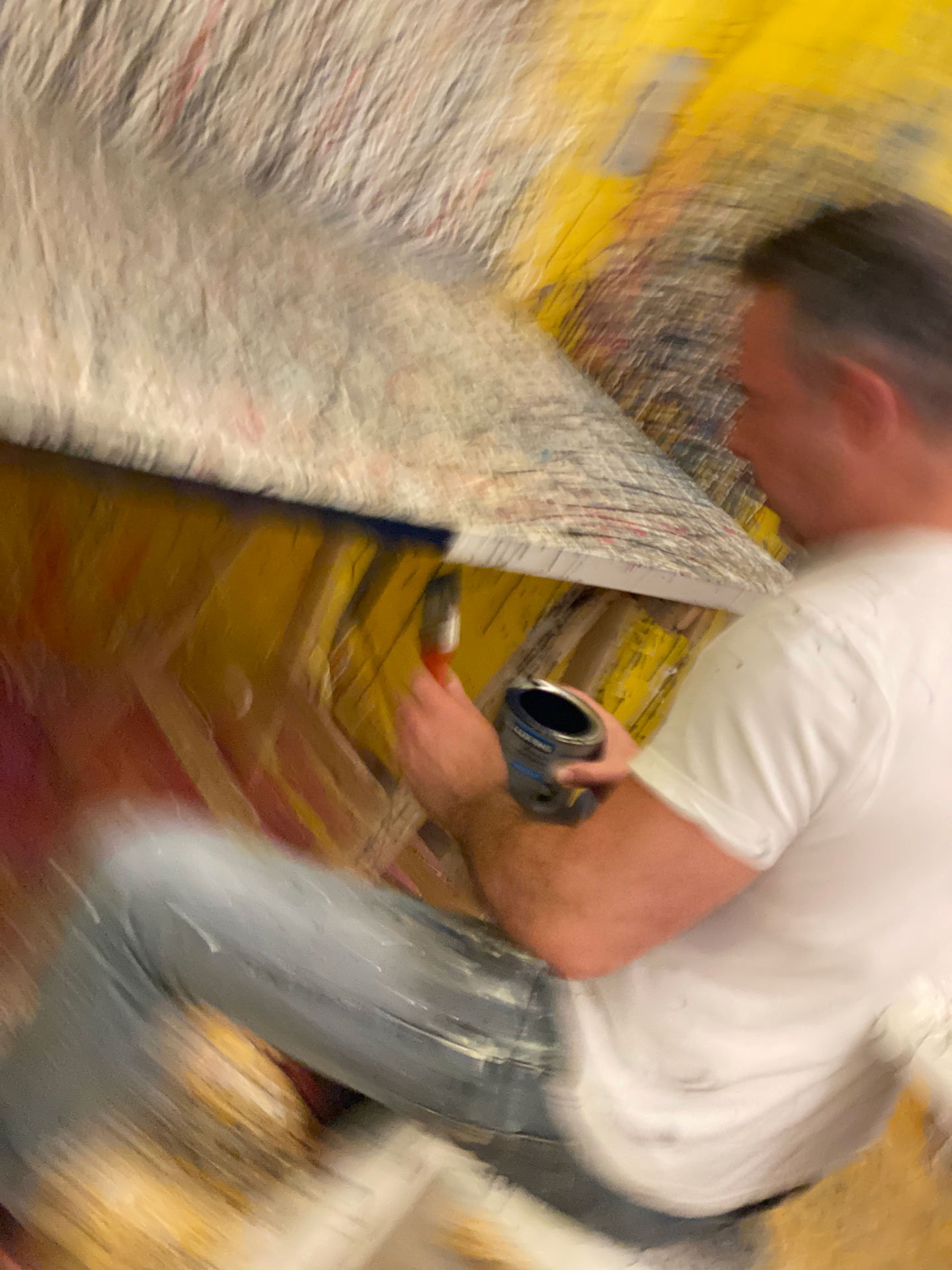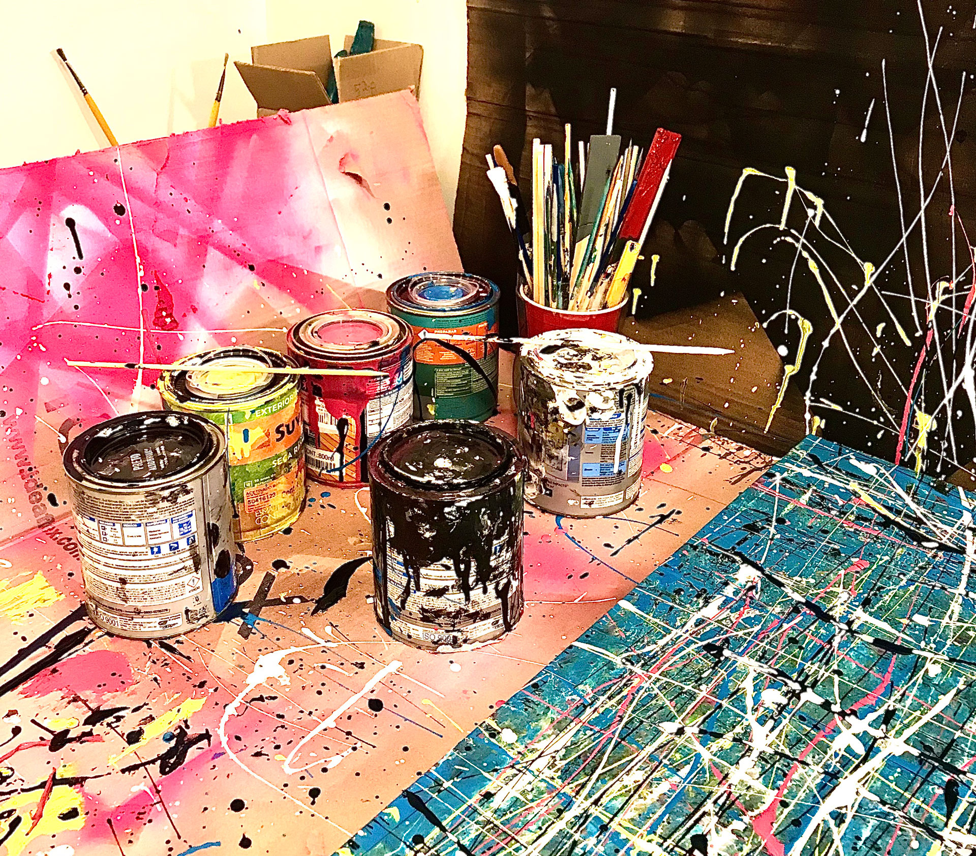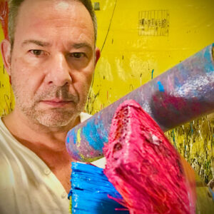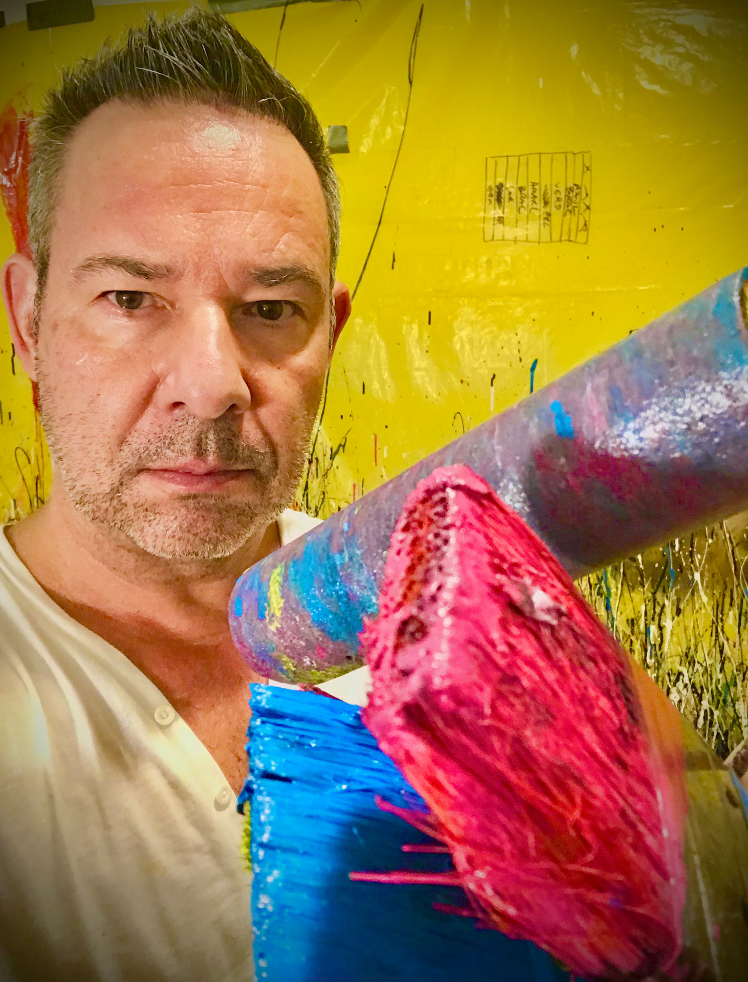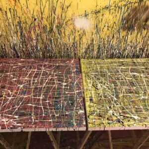 Adopting an unique abstract style of spontaneous and energetic moves, the artist attacks the canvas creating an havoc of layers that converge into an elaborated tapestry.